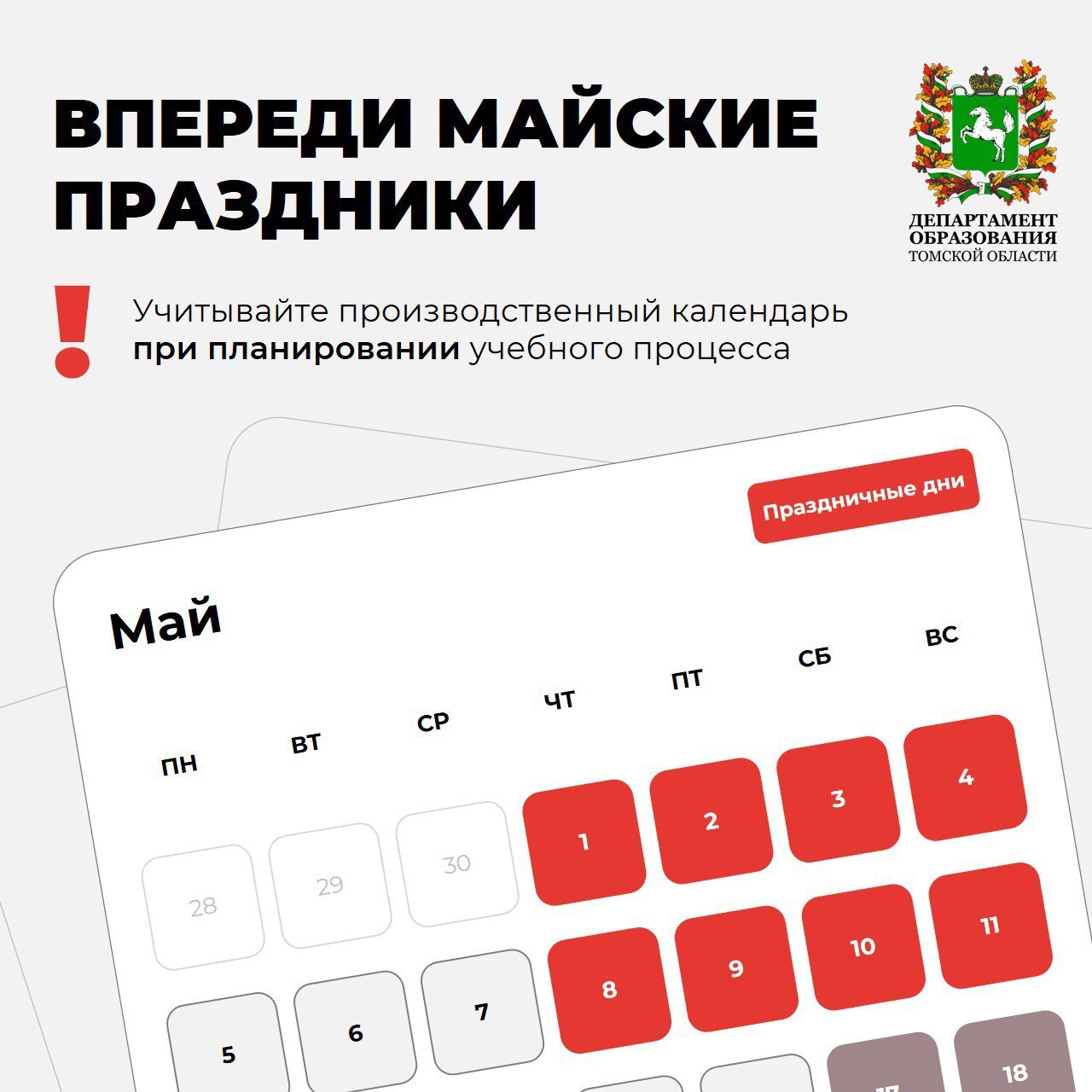 ❗️Обращаем ваше внимание, что 1-4 мая и 8-11 мая — дни, свободные от занятий, для дошкольников, школьников и студентов СПО ❗️
