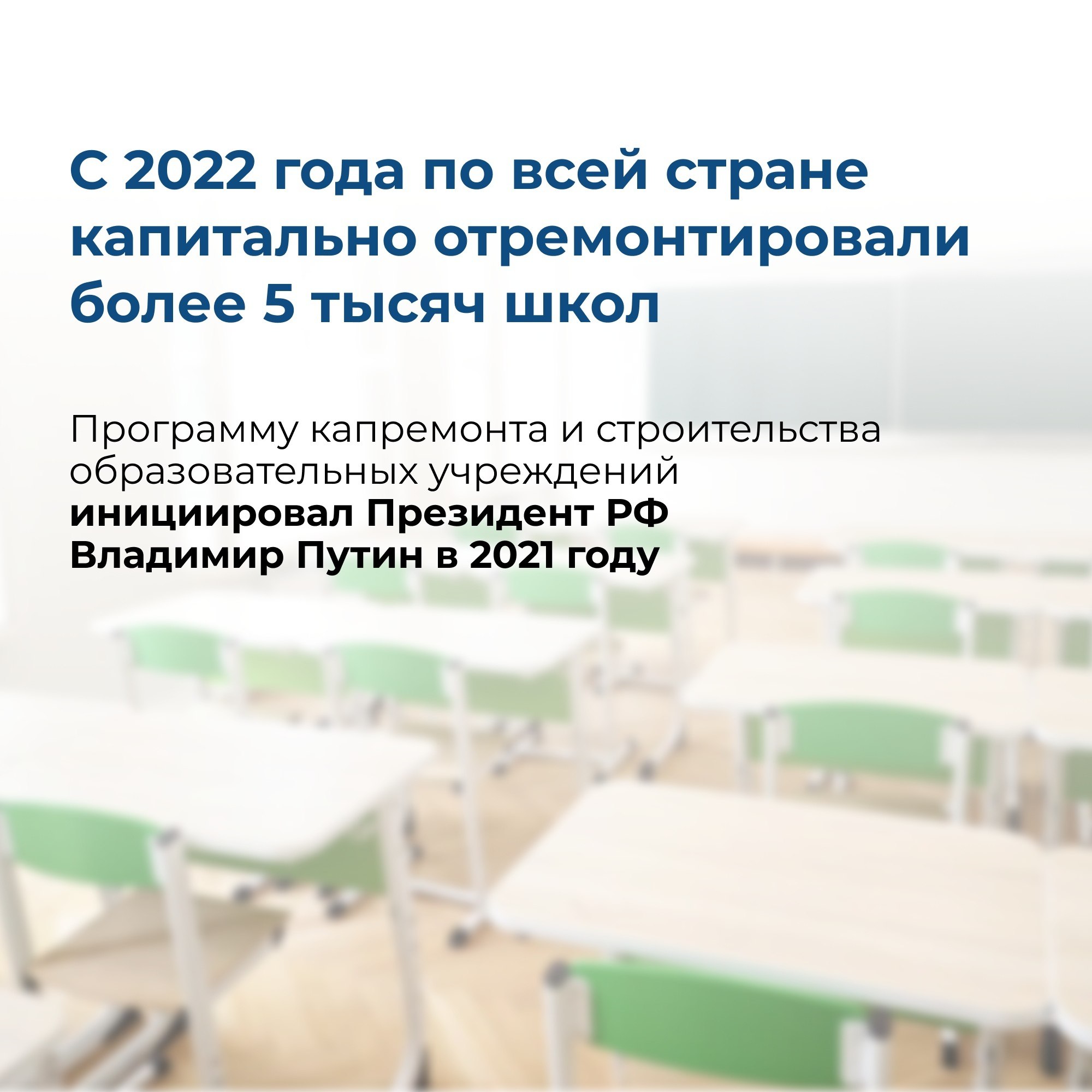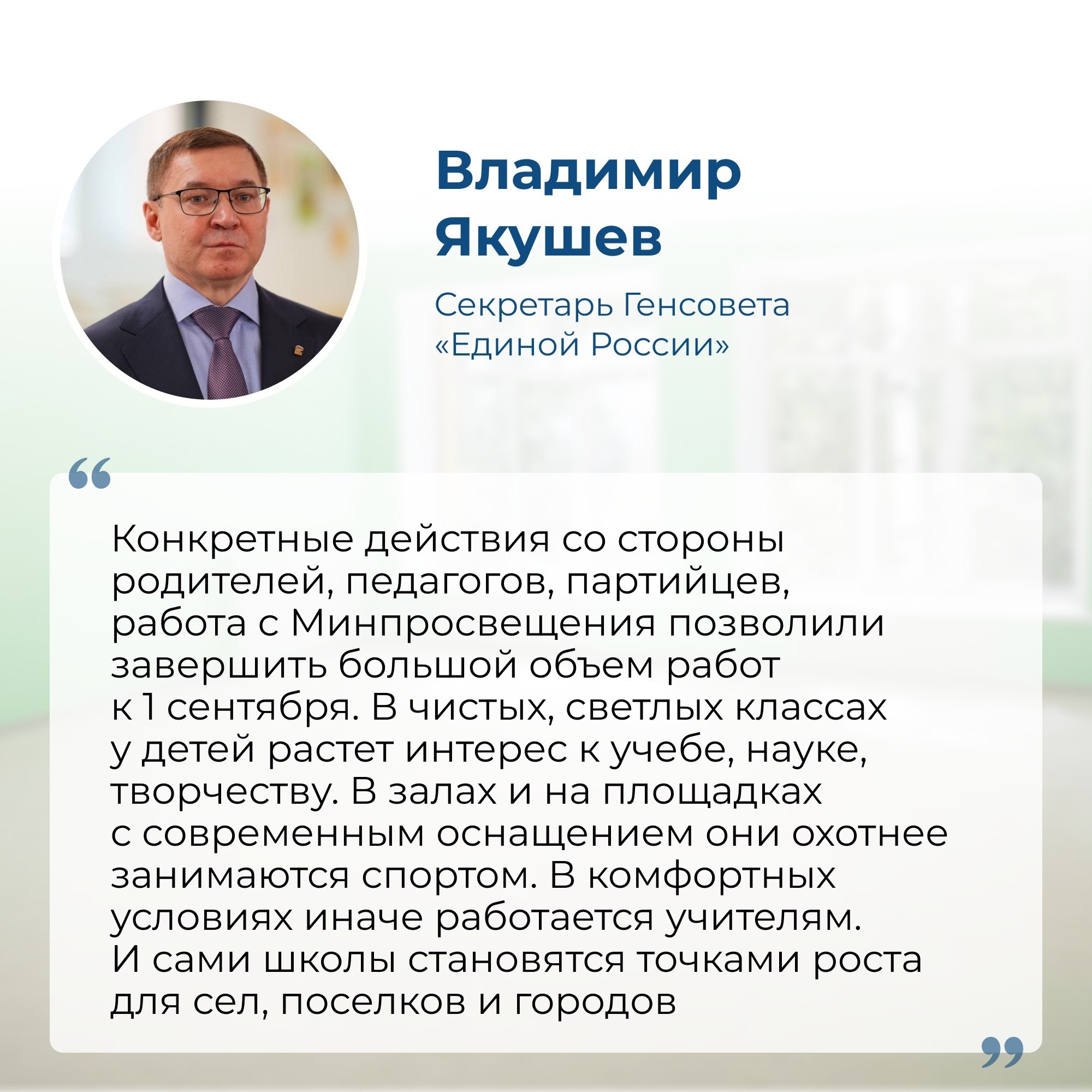 По словам Владимира Якушева, с 2022 года проведен капитальный ремонт 5602 зданий школ. Досрочно выполнено поручение Президента России о строительстве 1300 новых школ.