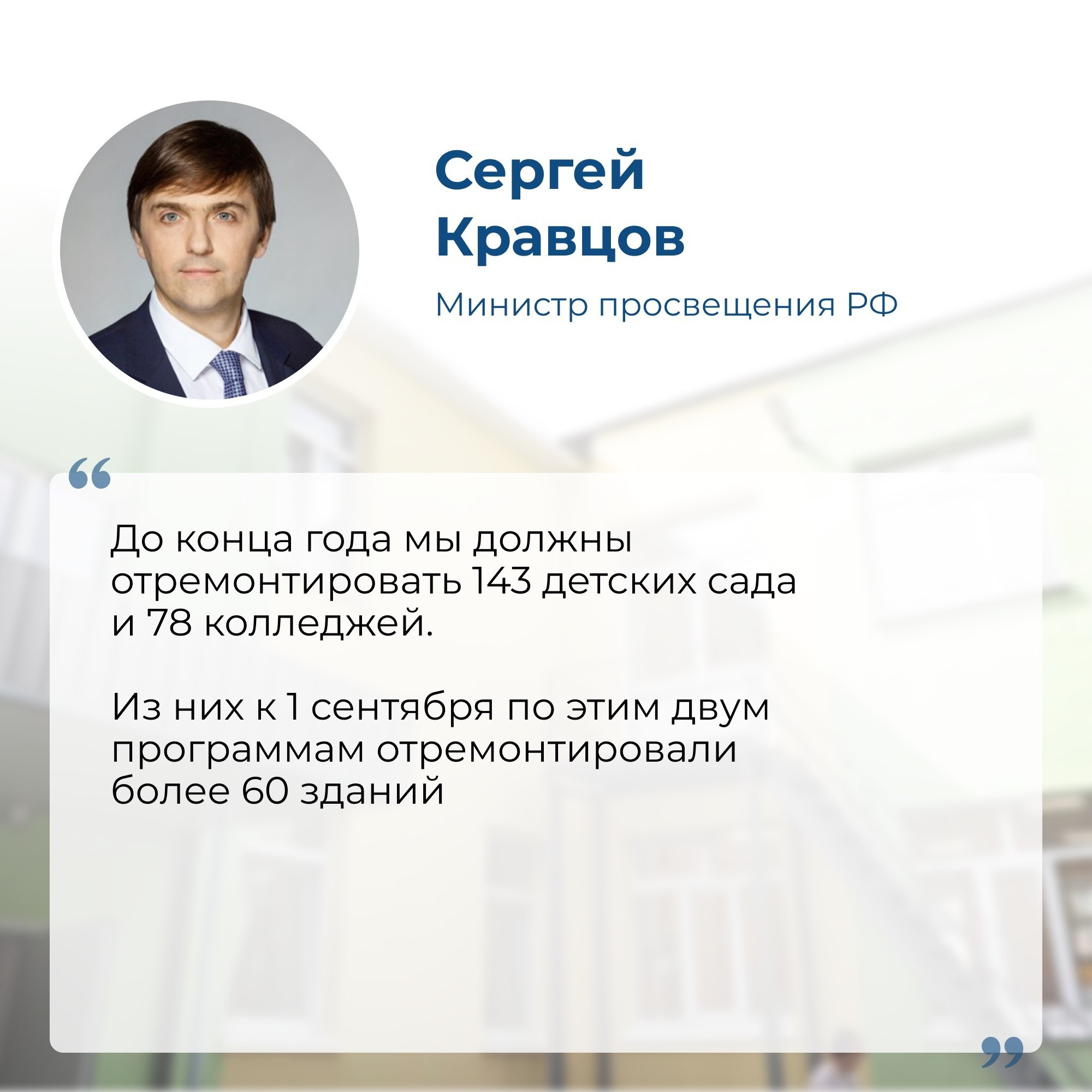 Сергей Кравцов рассказал, что до 2030 года в регионах построят еще 150 новых школ, 100 детсадов и 12 передовых школ. Также до конца этого года планируют отремонтировать 143 детских сада и 78 колледжей.